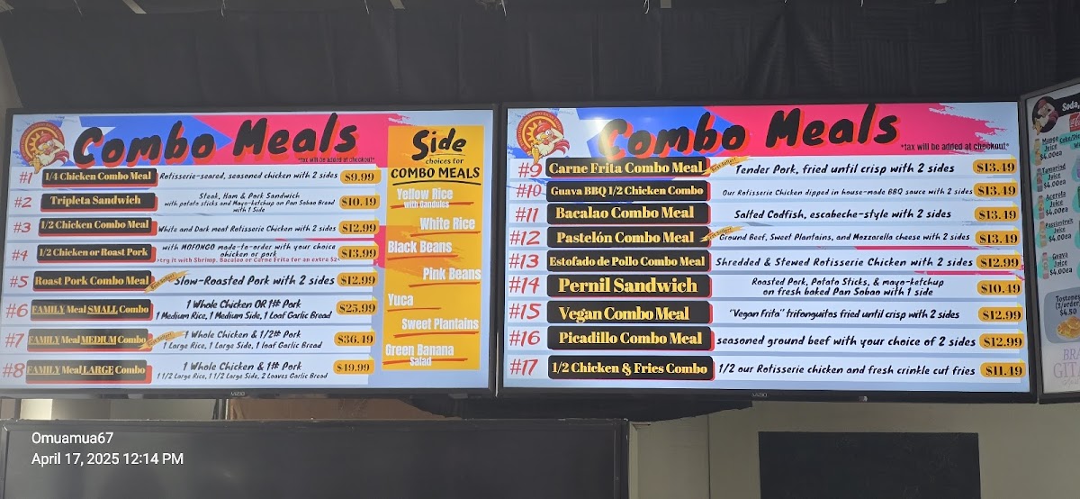 1 whole rotisserie chicken or 1 pound of roast pork. 1 medium rice, 1 medium side, 1 loaf garlic bread.